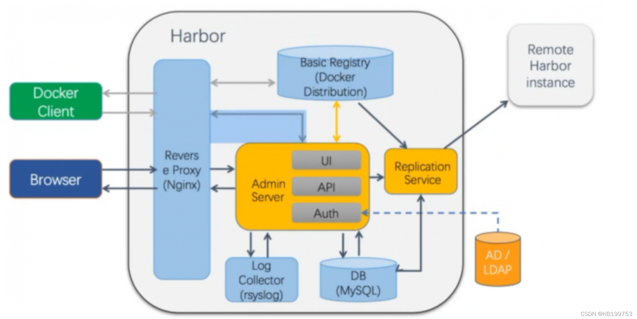 - Log Collector:对应启动组件harbor-log。日志汇总组件,通过docker的log-driver把日志汇总到一起。