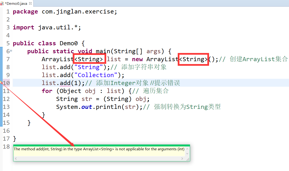 这种写法就限定了ArrayList集合只能存储String类型元素,将改写后的程序在Eclipse中编译时就会出现错误提示。