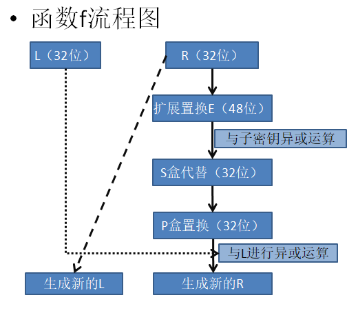 e. 最后将P盒置换生成的数据与本轮运算的L进行异或,生成新的R。