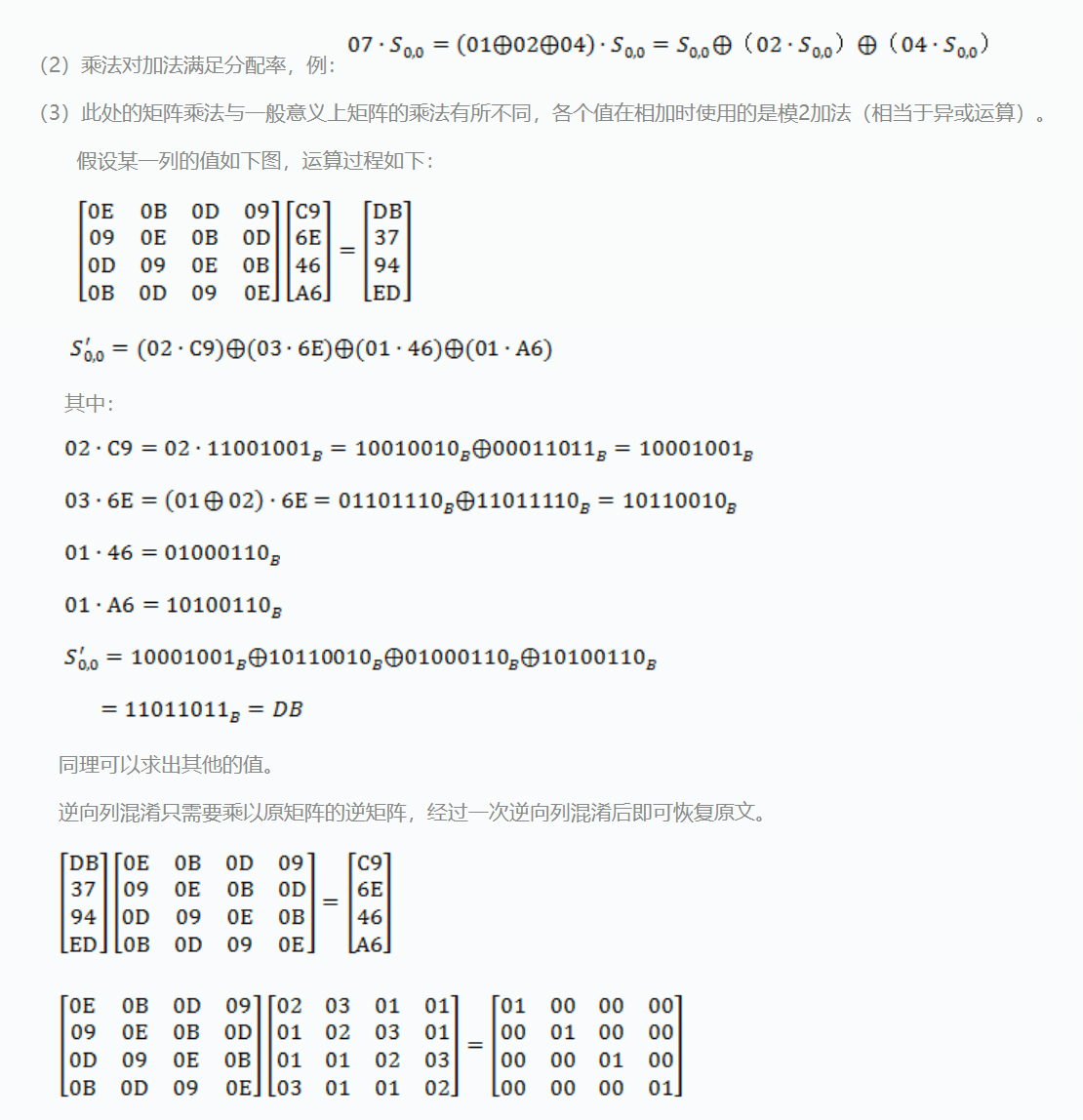 这里有一个错误,初始矩阵为,另外列混淆中第二项02·6E=11011100