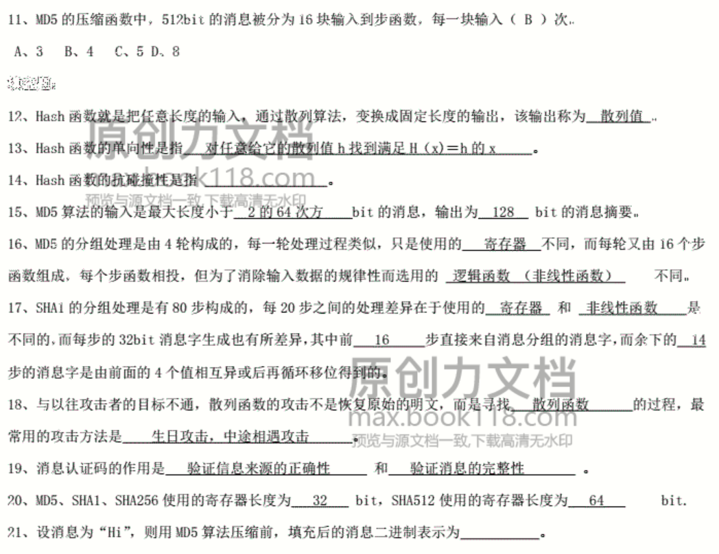 抗碰撞性:找到任意一对不同的M1和M2,使得H(M1)=H(M2)在计算上是不可行的。