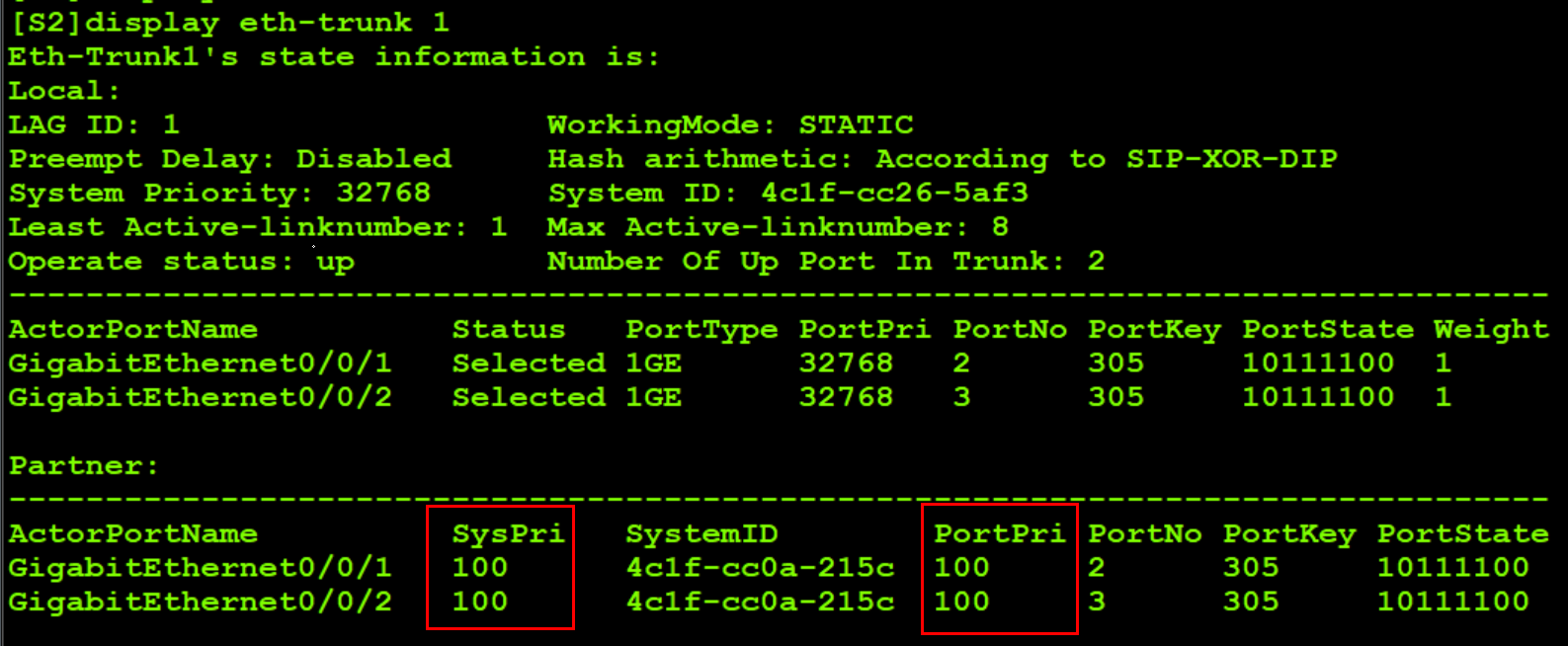 [S1-GigabitEthernet0/0/2]lacp priority 100