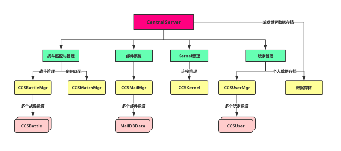 作为游戏的核心服务器,中心服承担着除战斗外的所有游戏功能,包括房间匹配,场景服(SS)战斗及玩家的管理控制,邮件系统,玩家实体创建和管理,Kernel核心管理,数据存储与缓存,游戏日志生成等。