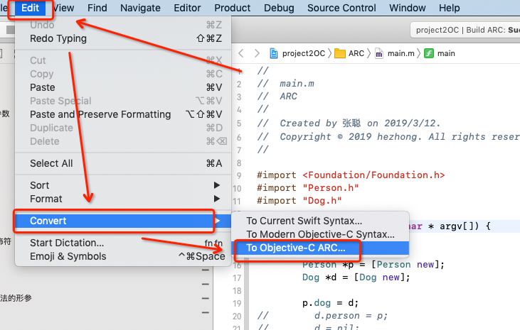 Xcode 功能提供了将MRC转换成ARC的功能,项目文件较多的情况下不一定能够转换成功
