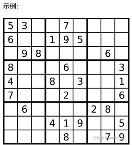编写一个程序,通过填充空格来解决数独问题。数独的解法需遵循如下规则:数字1-9在每一行只能出现一次;数字1-9在每一列只能出现一次;数字1-9在每一个以粗实线分隔的3×3宫内只能出现一次;数独部分空格内已填入了数字,空白格用’.’表示。