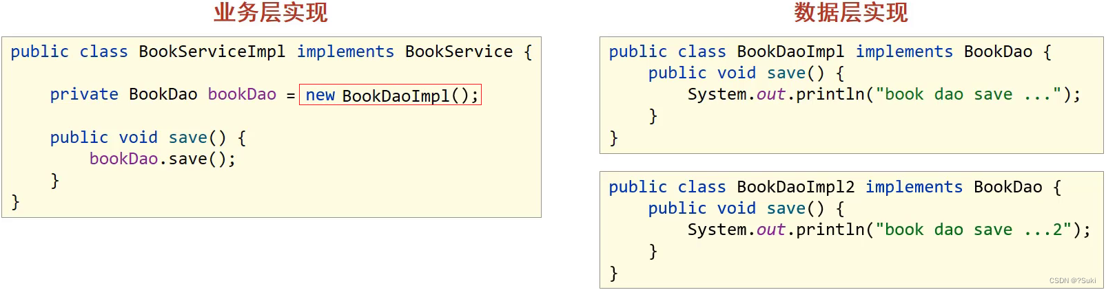 (2)如果数据层的实现类发生变化,那么业务层的代码也需要跟着改变,发生变更后,都需要进行编译打包和重部署