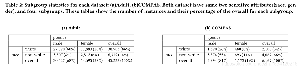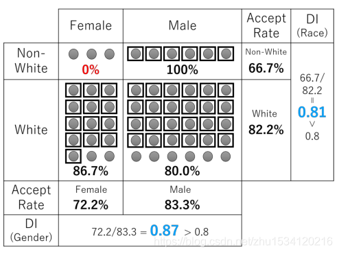 男性和女性,白人和非白人在大体上的接受率基本相同,但是可以明显看到非白人女性占有率0%,存在明显的歧视性,即一个受保护的群体在整体上似乎受到公平对待,受保护群体的一部分也可能受到不公平对待。
