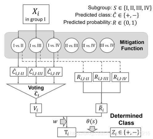该方法利用从分类模型或缓解方法中获得的多数投票结果和预测概率来计算每个实例的得分。对每对的缓解结果进行汇总,并根据最喜欢的类别的投票率和预测概率的平均值计算T。最终缓解结果Z由投票率是否超过阈值s决定