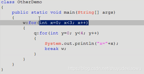 break语句只能应用于switch和循环结构中。注意break 在嵌套的循环结构中跳出的是内循环。想跳出外循环可以用给循环标号的形式以break跳出。