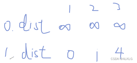 即第0次寻找,这时指针并未移动,所有点的最短路径都是∞。然后起点定为1号点,指针移向点1。