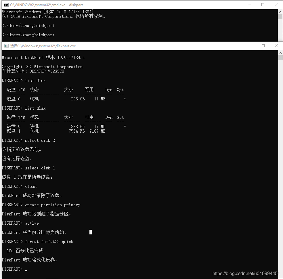 4、 #选择第一个磁盘 (这里我的sd卡是 disk 1,不确定哪个,可以进行拔插SD卡查询一下)