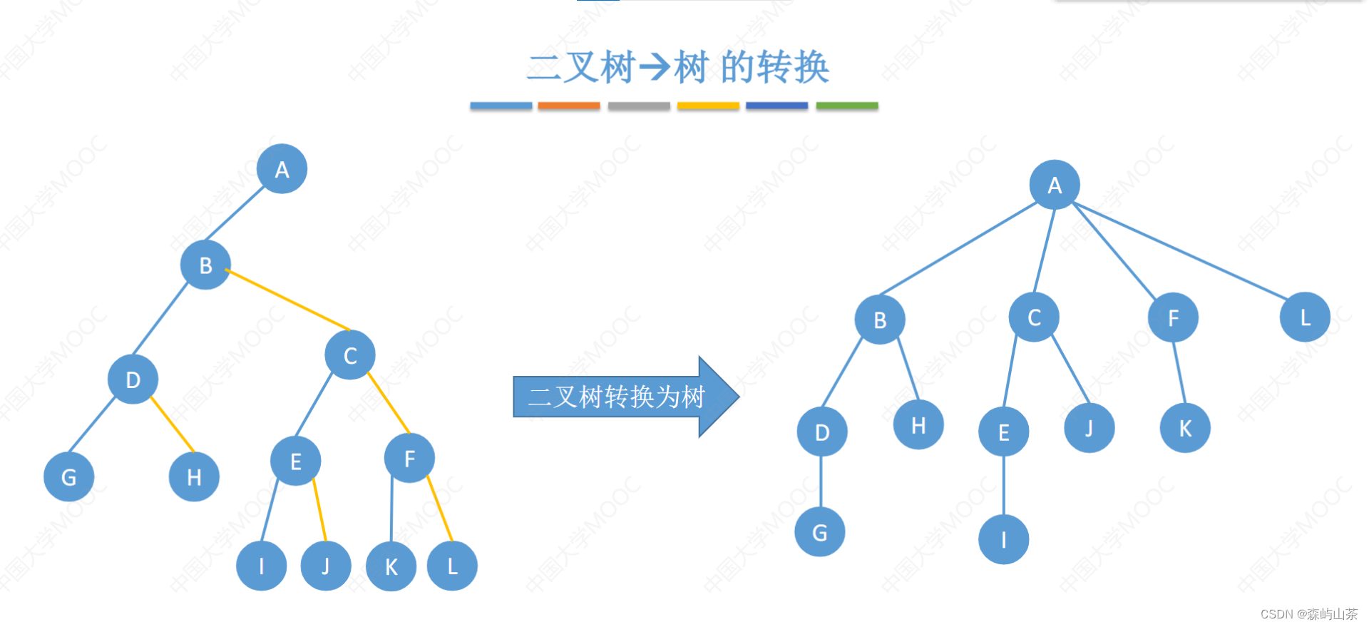 步骤与二叉树到树的转变相同,只不过第一串右子树要拆成不同的几棵树