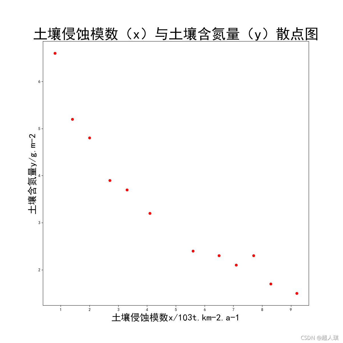 由散点图可以看出,随着土壤侵蚀模数的增大,土壤含氮量减少,因此土壤侵蚀模数与土壤含氮量呈负相关关系。