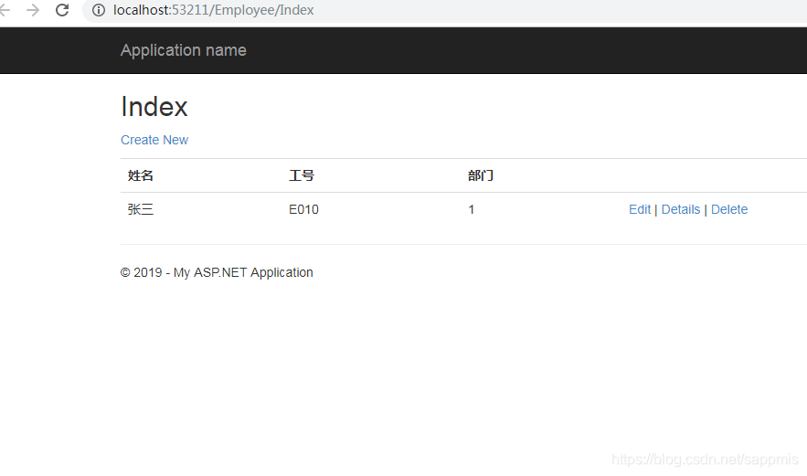 在页面上方中,有一个Creaet New的链接,在条记录的右边分别有Edit,Details,Delete这机个链接是视图自动生成的。