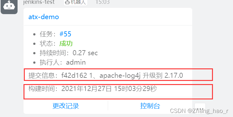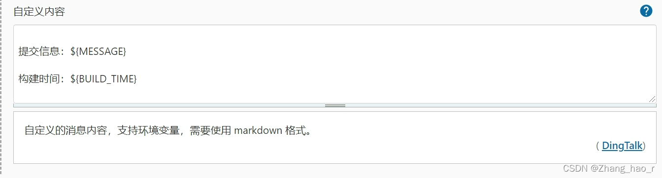 钉钉机器人自定义内容允许引用环境变量,可自定义Jenkins环境变量,在内容里面引用自定义的环境变量,以达到钉钉机器人输出指定内容(commit 记录,构建时间等)。自定义内容不会自动按格式输出,想一句一行,需使用markdown格式,中间换一行隔开。
