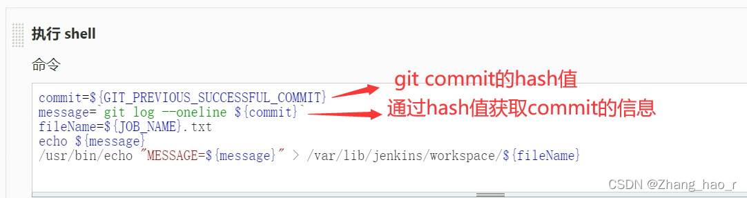 3.在钉钉里面输出git commit信息,在构建里使用执行shell,使用Jenkins内置环境变量(可自行查询了解Jenkins环境变量)获取最后一次提交记录(如果有),获取的是hash值,使用git log –oneline ${commit}查询提交的信息。