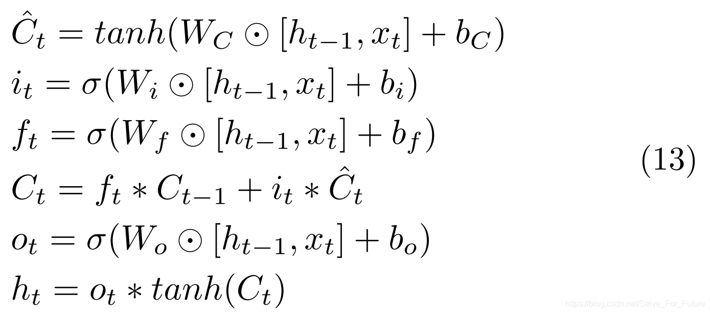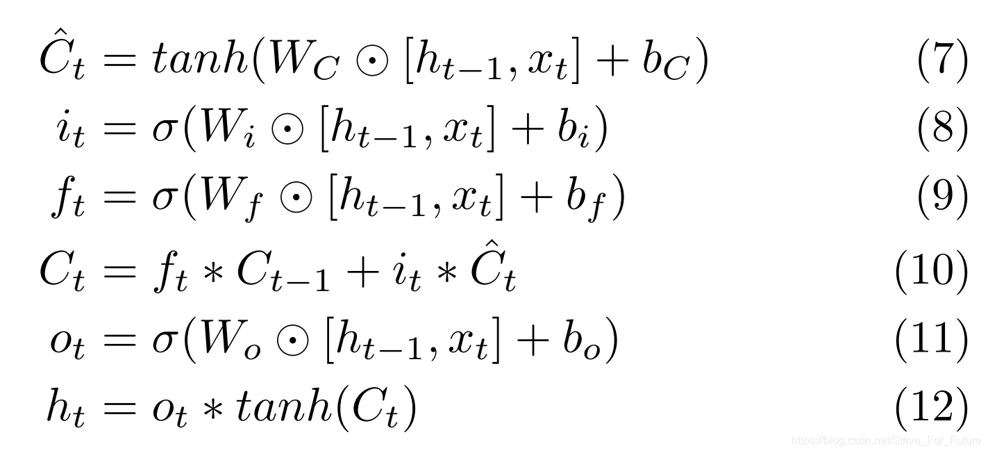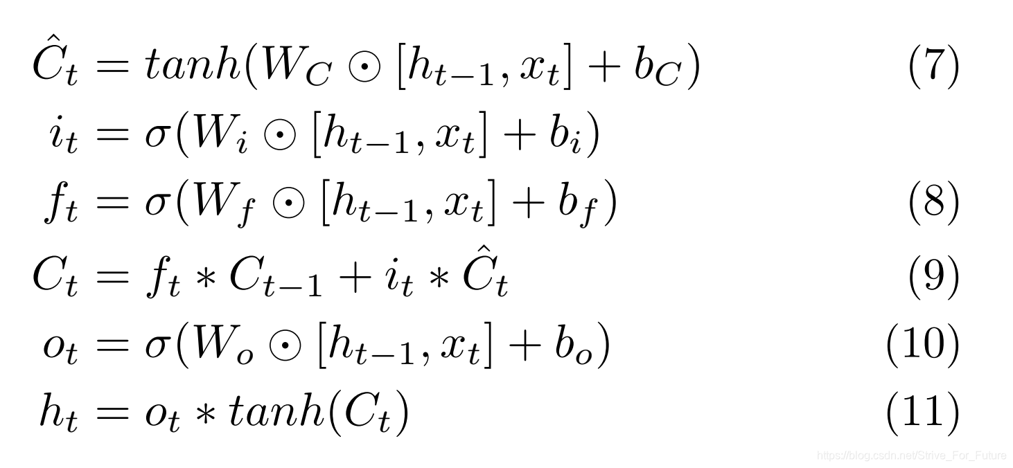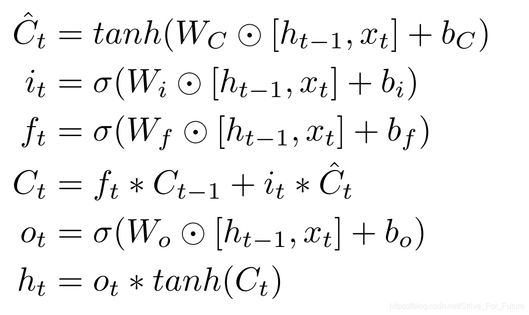 \hat{C}_t &= tanh(W_C\odot[h_{t-1},x_t]+b_C) \\