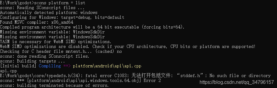 报了一个跟之前一样的错 (看来这个Scons 平台指定错误,就直接按当前平台编译了)这次看下具体报错