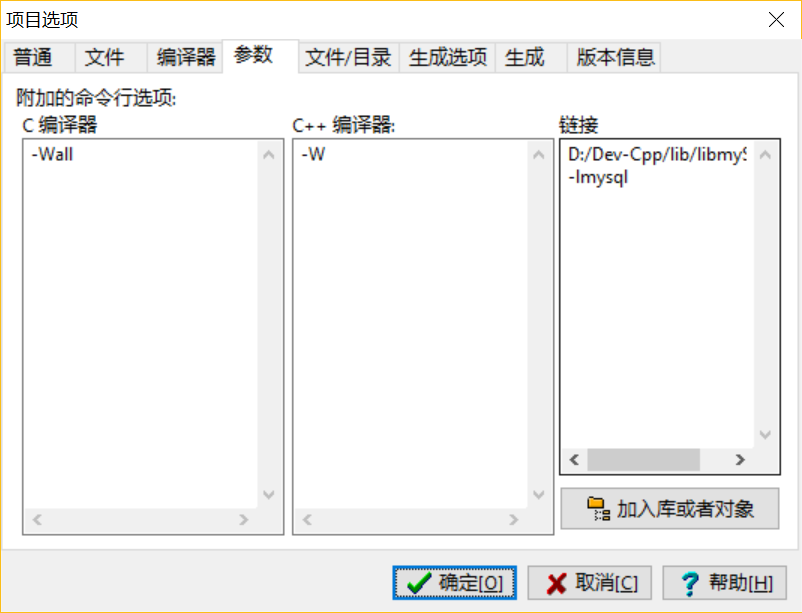 链接里->加入库或者对象,(找到DevC++安装目录/lib/libmysql.a),