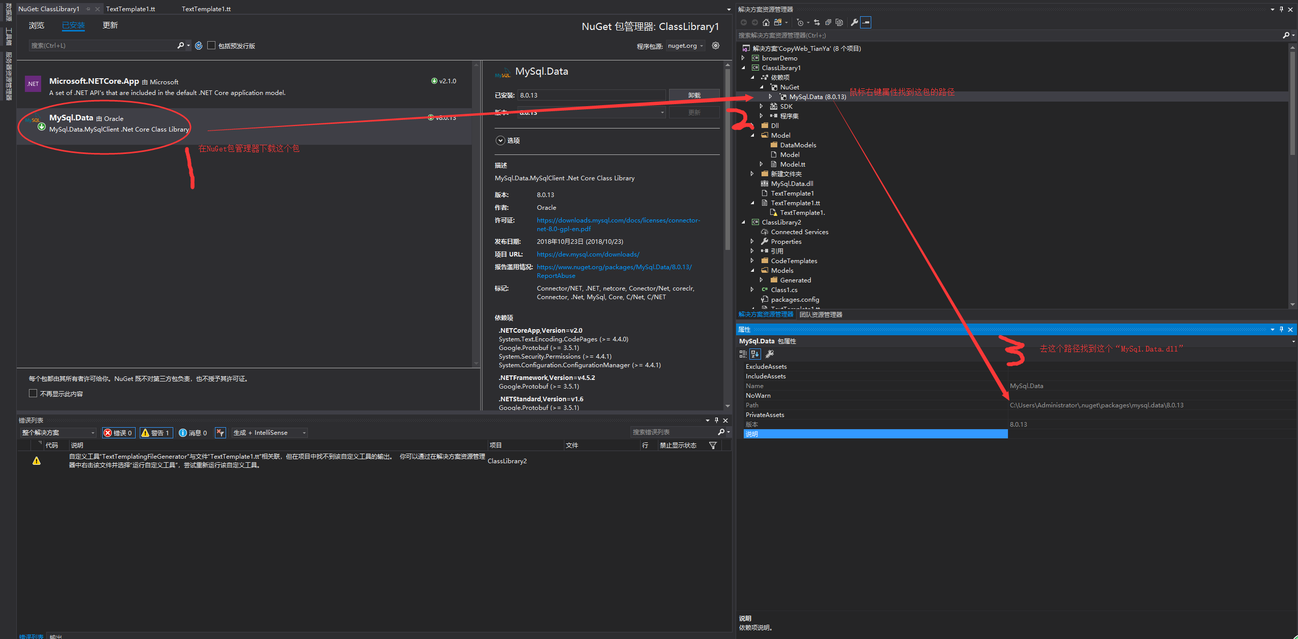 <#@ assembly name=”$(ProjectDir)MySql.Data.dll” #> //MySql.Data.dll需放在项目根目录也可以自行更改