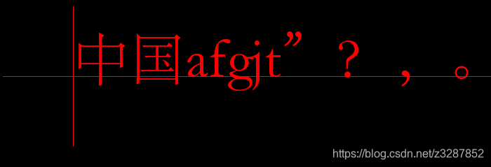 (4)(5)$x,$y 被绘制字符串的第一个字符的基线点。单位是像素。这里涉及到字体设计的基本知识–基线。这个点绝对不是左上角,而具体是什么取决于所使用的字体是如何设计的。对于宋体、楷体、黑体等常见的字体中的汉字,这个点大概位于字体的左下部分;而对于英文字母和标点符号,则各不相同。如下图: