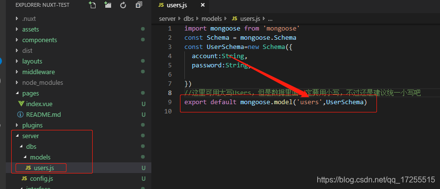 - 数据查不出来,原因:如下图,之前我写的是 export default mongoose.model(‘Users’,UserSchema),数据表也是“Users”后来发现数据表要小写才可以,所有就统一用小写了