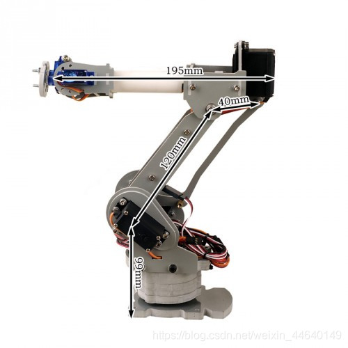 sainsmart机械臂采用六个舵机作为关节的执行件,由图可以看到,1234轴采用MG995舵机,56轴采用SG90舵机