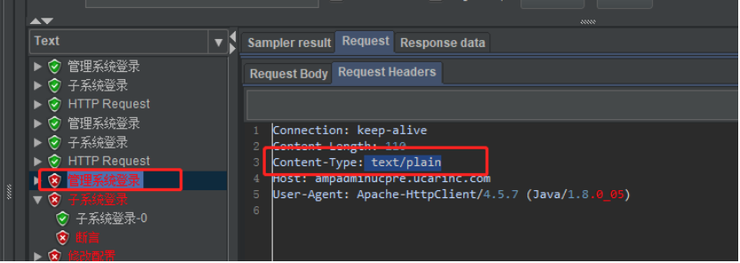 下图中POST方式的登录接口未设置HTTP Header Manager,运行jmeter脚本发起接口请求时默认Content-Type:text/plain(纯文本格式),所以请求会报错,返回状态码500。