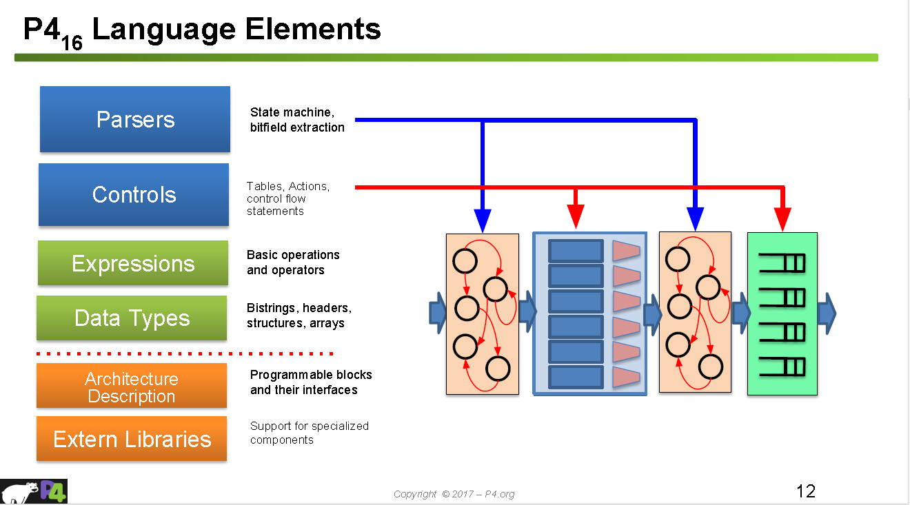 上图展示了P4语言主要结构,下面简单讲解一下P4的基本语法
