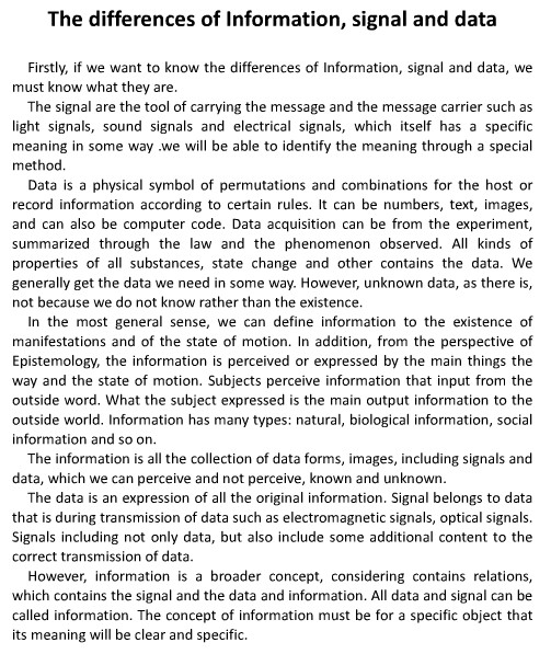 举例子来说:你在打电话,电话线要有【信号】,交换机交换语音【数据】,而你和接电话的人交换的是【信息】。