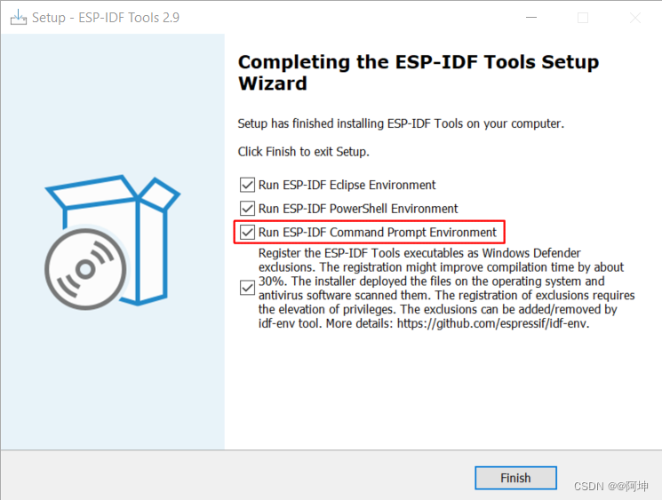 安装结束时,如果勾选了 Run ESP-IDF PowerShell Environment 或 Run ESP-IDF Command Prompt (cmd.exe),安装程序会在选定的提示符窗口启动 ESP-IDF。