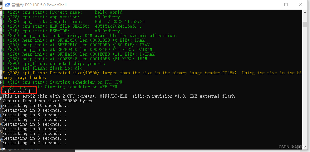您可以使用 idf.py -p PORT monitor 命令,监视 “hello_world” 工程的运行情况。注意,不要忘记将 PORT 替换为您的串口名称。