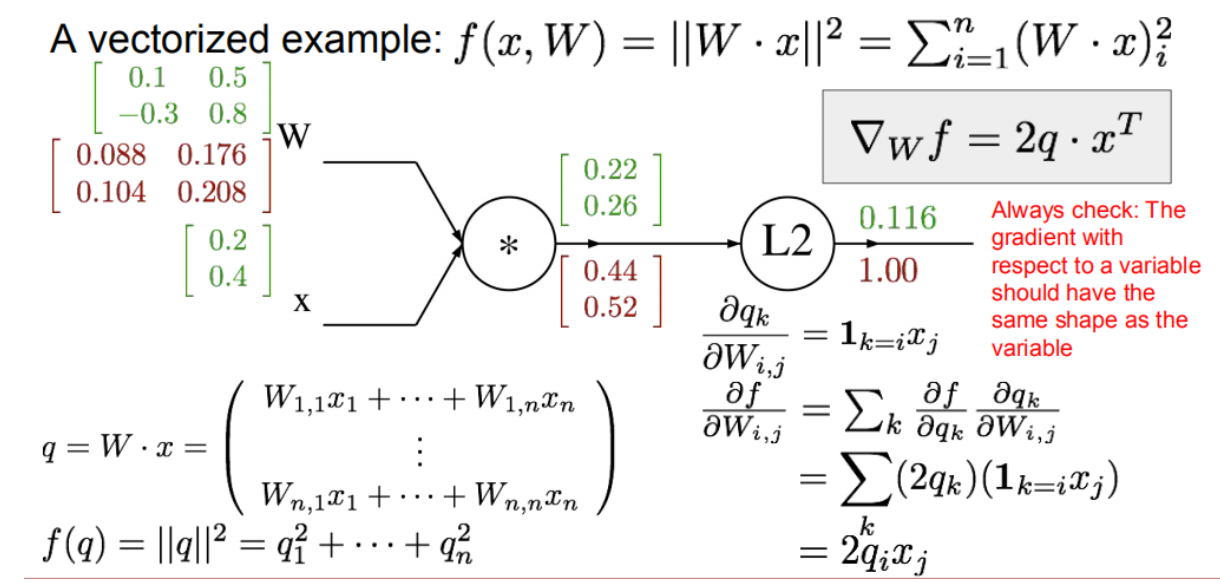 2+…+qn**2, 反向传播先计算 f 对q 的偏导, 再计算 q 对W的偏导,得到f 对W的梯度。 利用了 前向传播计算的q。