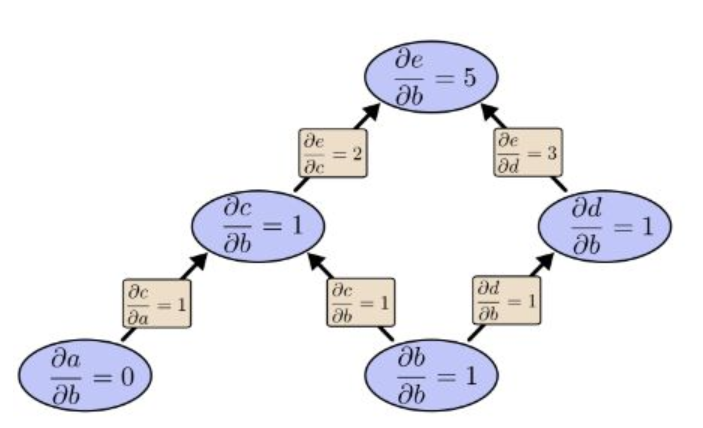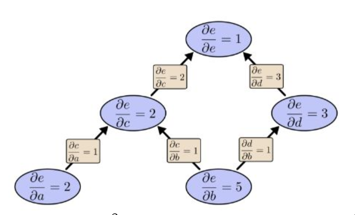 前向模式,一次只能求出 e对b的偏导, 而反向模式 可以同时 求出 e 对a 和b的偏导。