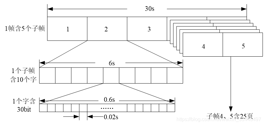 电文的基本单位是长达1500bit的一个主帧,广播速率为50bit/s。每一主帧又分为五个子帧,每个子帧长度为6s,第1,2,3子帧各有10个字码,每个字码为30bit,第4,5子帧各有25个页面,共有37500bit,长达12.5min(如上图所示)。它们不像第1,2,3子帧那样,每30s重复一次,而需要长达750s才能够传送完毕第4,5子帧的全部信息量,亦即,第4,5子帧是12.5min才重复一次。这表明,一台GPS信号接收机获取一帧完整的卫星导航电文,需要750s。