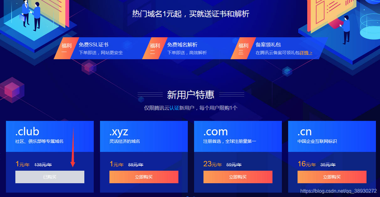 要建立个人网站,有三个必备要素:域名、服务器和程序。域名我是从腾讯云上购买的,最近刚好有活动1块钱就可以买一个域名使用一年,毕竟是打算自己用来学习的,就没有买太好的域名,选了一个.club的域名