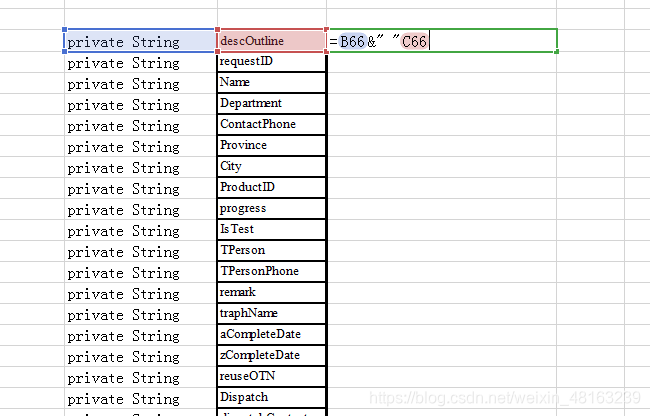 点击private String 单元格 鼠标放在单元格右下角变成+号时 按下左键下拉到相应长度后松开鼠标 复制出private String