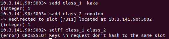 分区后,涉及多个槽的操作会失败。比如本例中集合class_1落在5003中某个槽,clss_2落在5002的7311,sdiff就直接报错了…redis cluster实现了一个称为