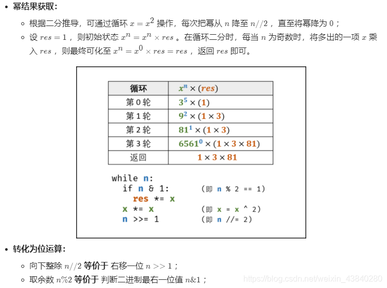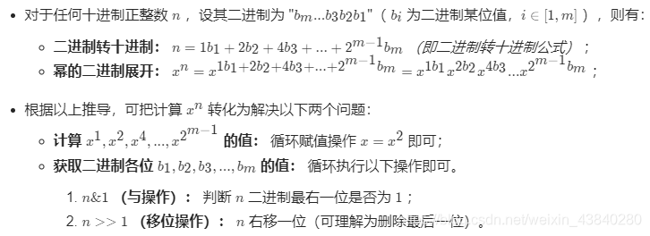 为从二进制角度的快速幂方法往下进行。对于任何一个十进制数字n的二进制表示,都有:
