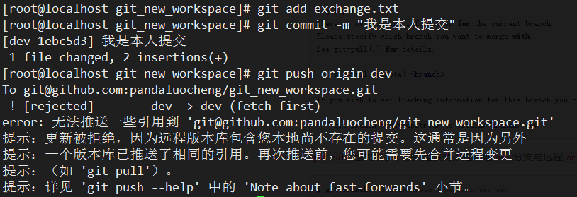 你小伙伴已经向origin dev分支上提交了,你也要对同样的文件修改,并试图推送: