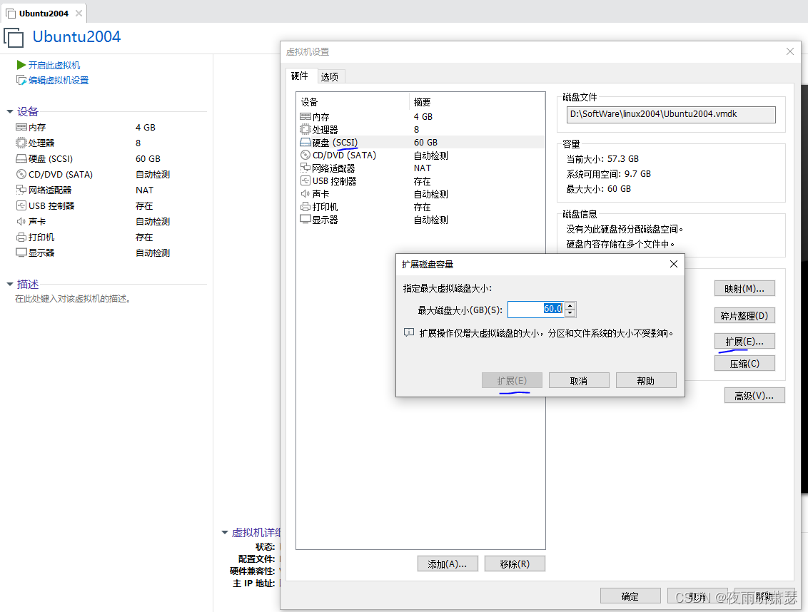 点击编译虚拟机设置,点击硬盘,点击扩展,扩展到一定容器。