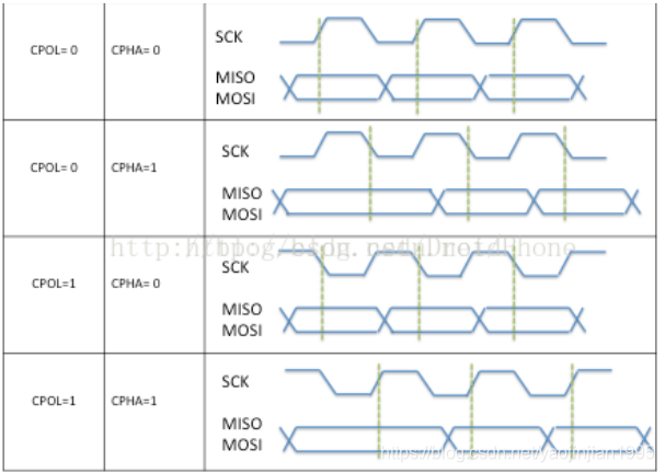CPOL表示时钟信号的初始电平的状态,CPOL为0表示时钟信号初始状态为低电平,为1表示时钟信号的初始电平是高电平