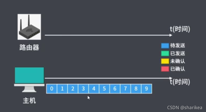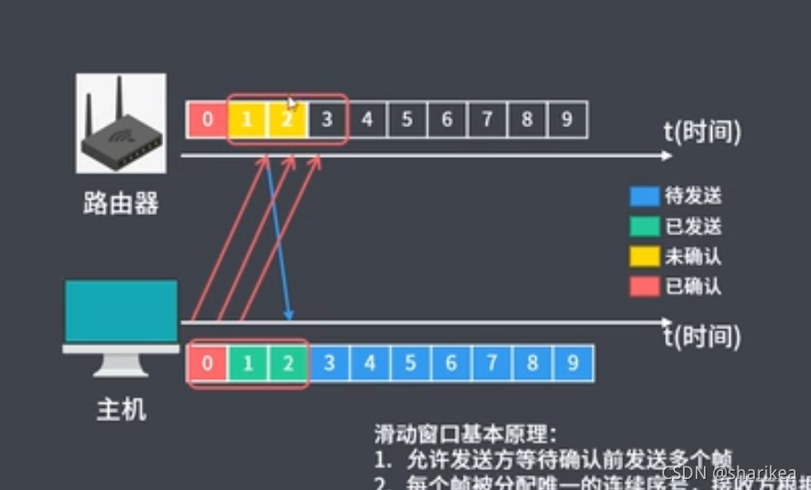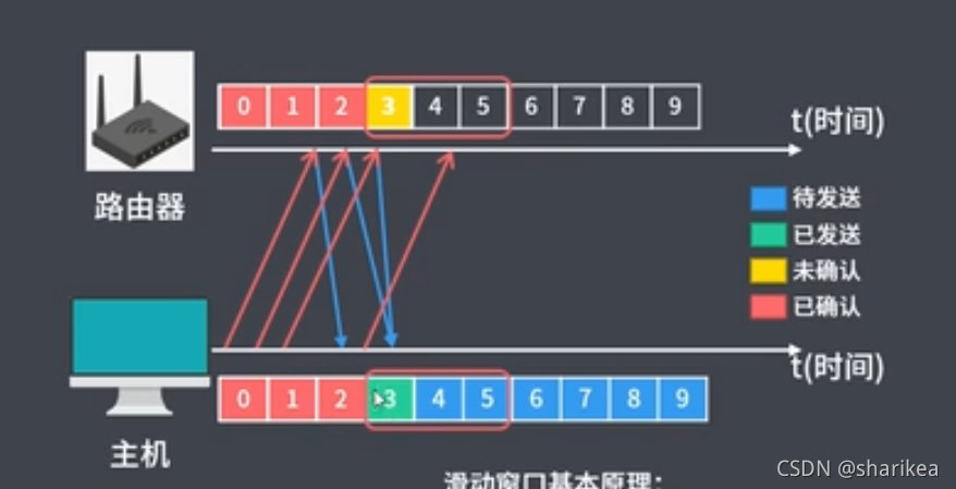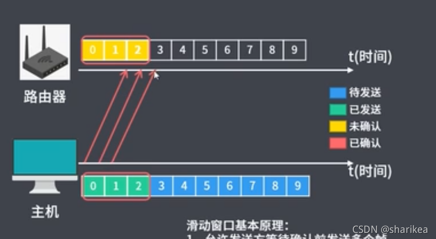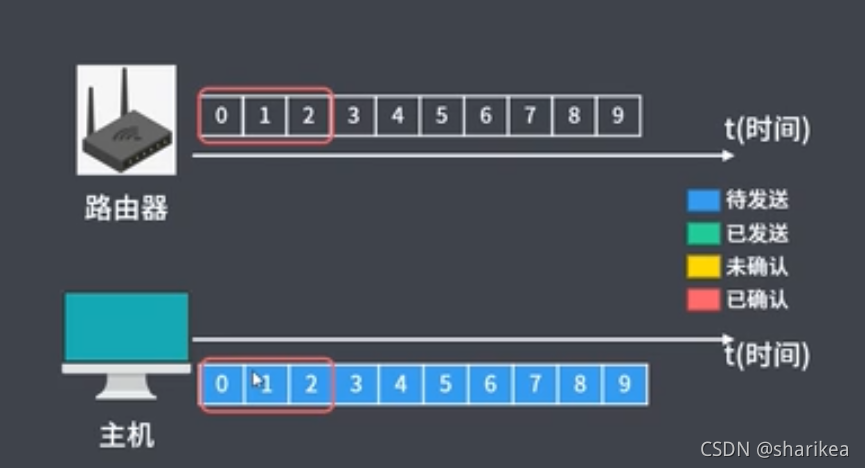 此时的状态为发送端已经把数据传输给接收端,接收端还未给发送端传达ACK确认 ,接收窗口和滑动窗口都固定在这,发送端会设置一个定时器,如果发送的数据包因为某种原因丢包了接收端没收到,或者接收端给发送端发出的ACK确认因为某种原因丢了,发送端没收到,此时当发送端设置的定时器时间超时,则会重新发送没有收到确认的数据包(如图,比如数据包为0、1、2 接收端收到了0号数据包也成功发送的确认消息,发送端也收到了0号数据包的确认收到消息,发送端的0号会变成红色已确认状态,而1、2号数据包则会根据定时器判断是否超时重新发送)。接收端0号数据包发送确认消息后会移动窗口,即新的窗口为1、2、3,发送端在接收到确认消息后也会移动窗口新的窗口为1、2、3。