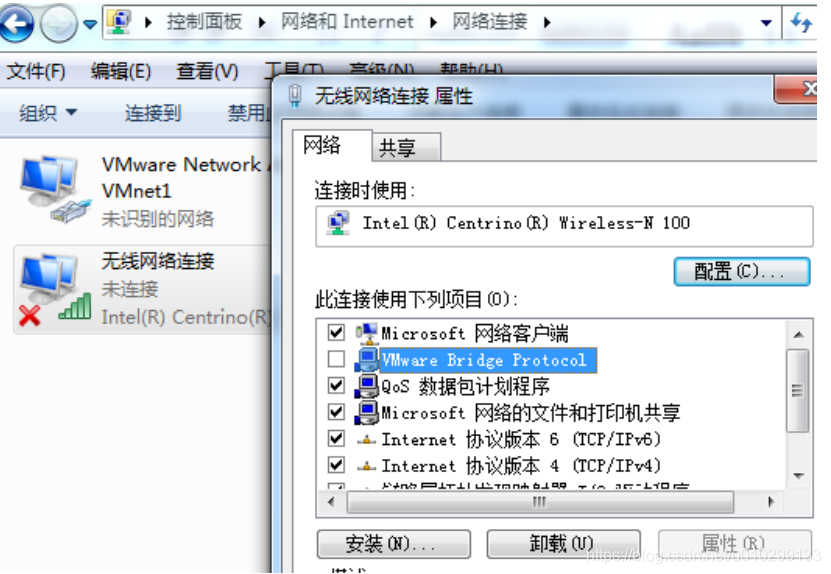 设置 PC 主机端, 把无线网卡—》属性里面里的 vmware bridge protocol 的√去掉