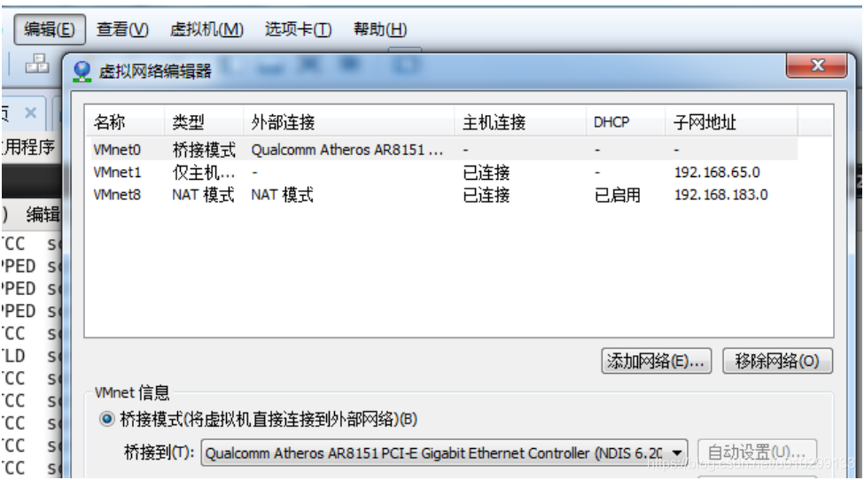 虚拟机工具栏处点击 编辑->虚拟网络编辑器->Vmnet0->桥接到有线网卡 (显示为有线网卡信息,默认桥接方式为自动) 。如下选择为有线网卡