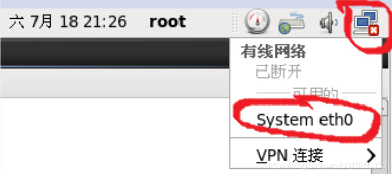再点击下面的有线网络图标,选择网卡开始连接,此处为网卡 0, System eth0