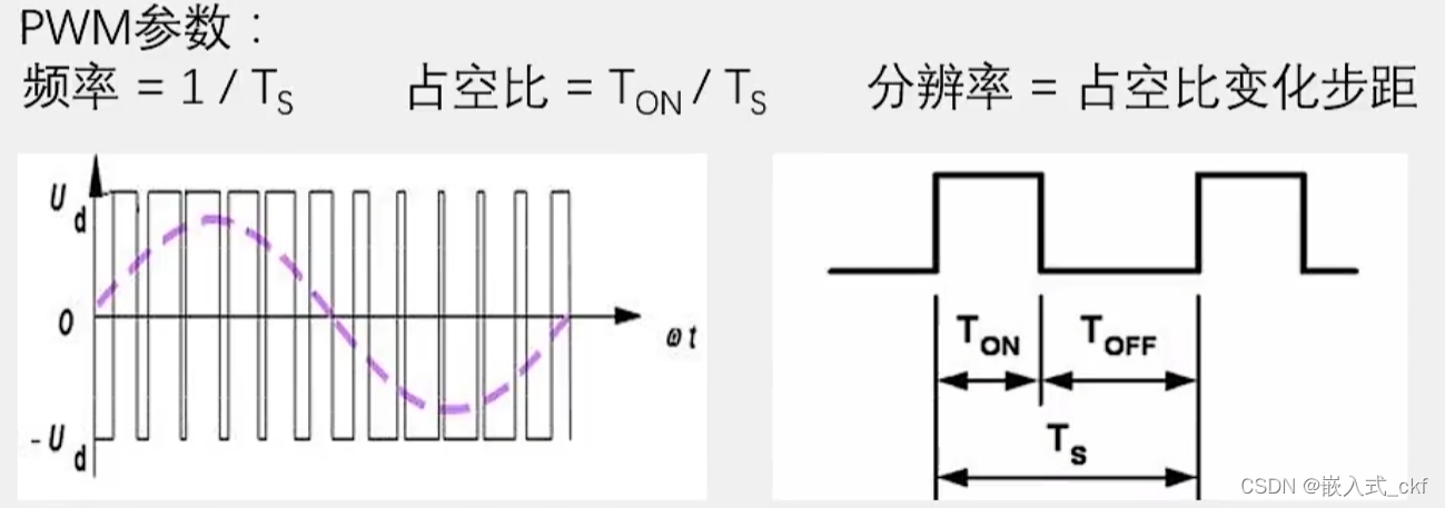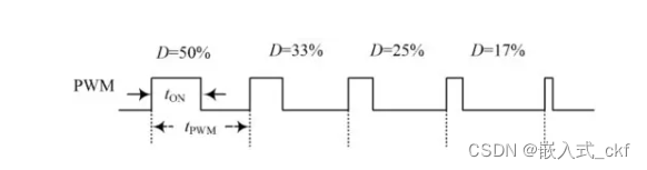 所谓PWM,就是脉冲宽度调制技术,其具有两个很重要的参数:频率和占空比。频率,就是周期的倒数;占空比,就是高电平在一个周期内所占的比例。如当周期T=T1+T2;T1为高电平时间,T2为低电平时间,此时频率F的值为1/(T1+T2),占空比D的值为T1/(T1+T2)。通过改变单位时间内脉冲的个数可以实现调频;通过改变占空比可以实现调压。占空比越大,所得到的平均电压也就越大,幅值也就越大;占空比越小,所得到的平均电压也就越小,幅值也就越小,如动图演示所示。PWM方波的示意图如下图所示: