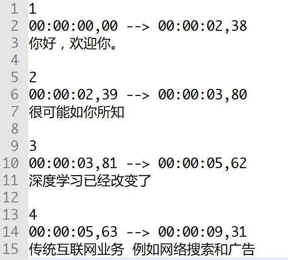 首先第一行是序号,第二行是开始时间(时:分:秒,小数位,如00:00:02,81就是2.81秒)和终止时间,第三行是字幕文字,后面一定要加上一个空行。