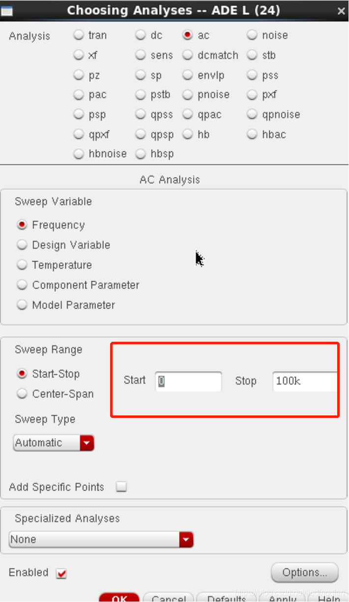 R=10K,C=700pF,由公式得截止频率Fc=22784Hz,做AC仿真(0~100kHz)(做AC分析,关于频率的分析时,理想输入源的频率设不设不影响)