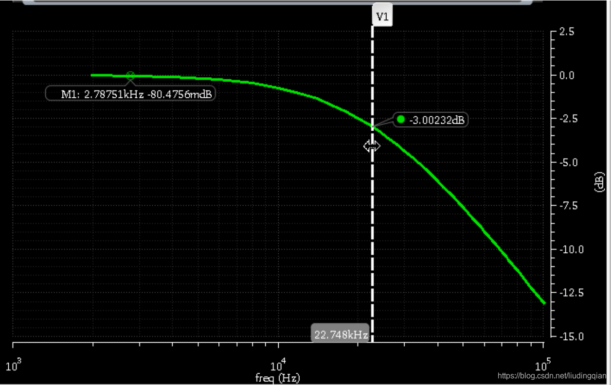 从上图可知,最开始的增益基本就是0dB,在22784Hz时,增益的衰减是3dB,和理论差不多。
